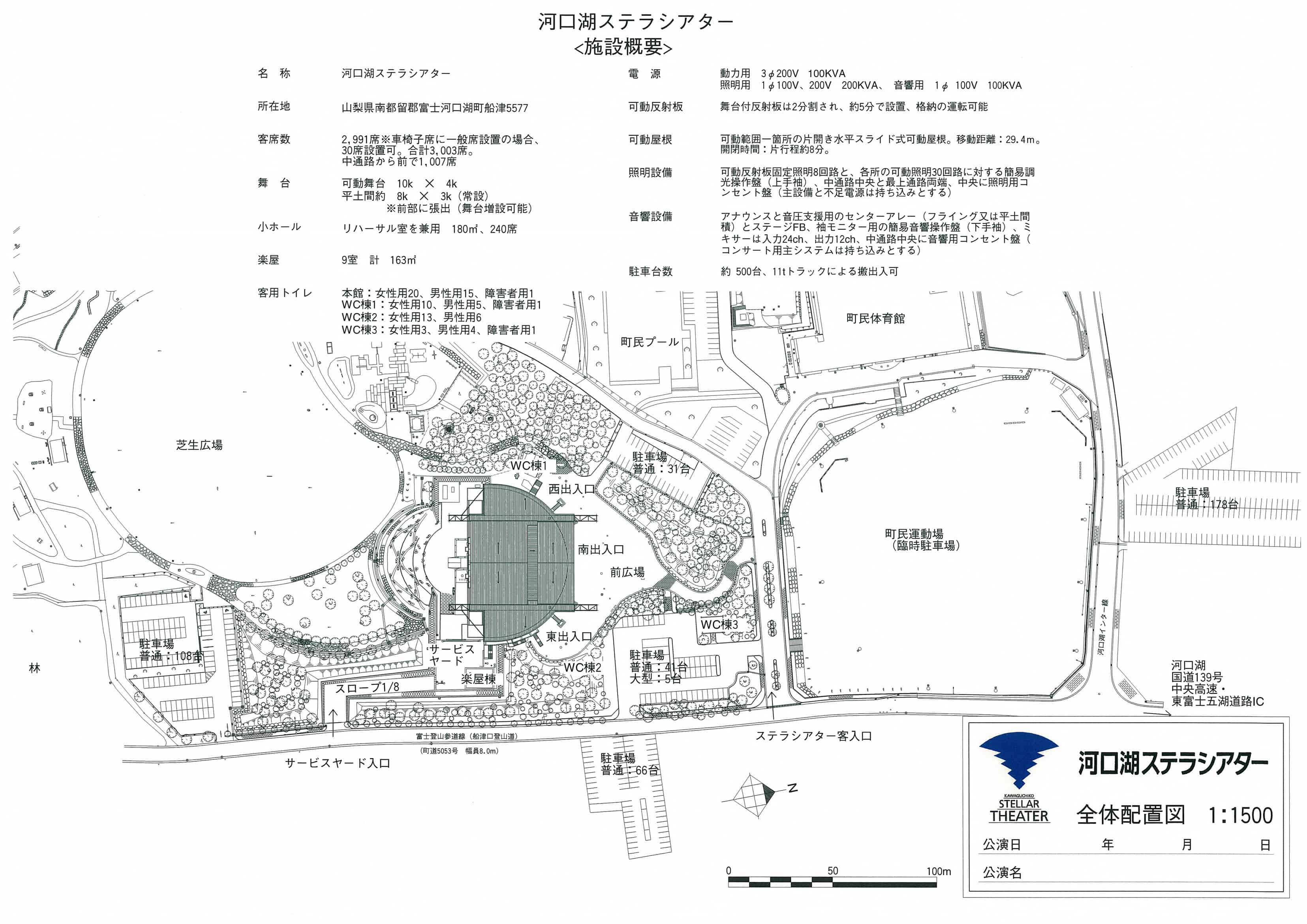 - 客席:半円形すり鉢型形式 傾斜角度30度 2991席(固定席 + 車椅子席)